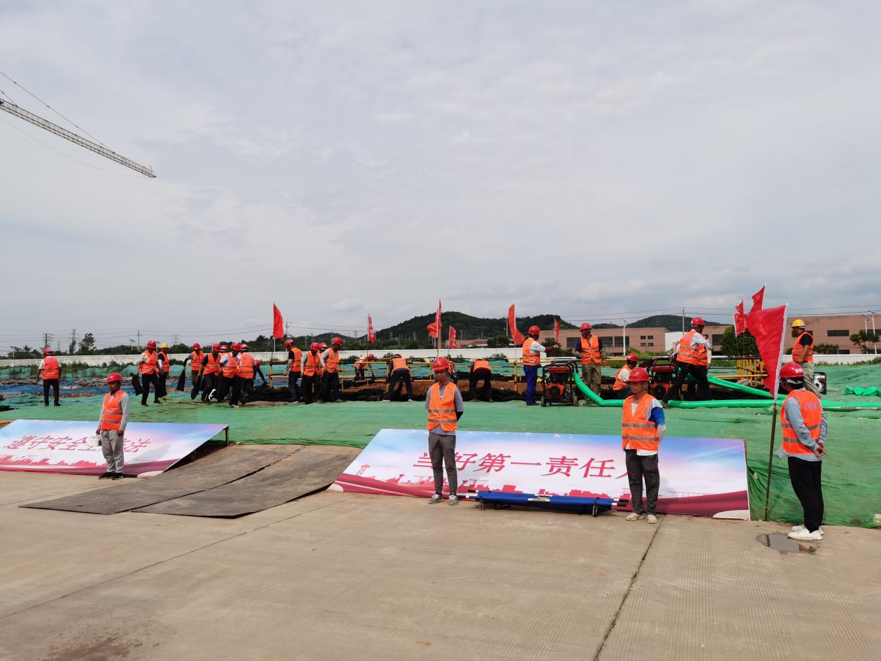 演练中,工人在巡查中发现,由于连日大雨,工地基坑中已形成积水,立即上报项目部。项目应急抢险组启动应急预案,组织抢险队伍提前做好应急抢险工作。不到10分钟,第一组应急抢险分队成员就整装集结完毕,按照指令奔赴积水路段,同时,防汛工具、车辆设备等物资运抵现场。