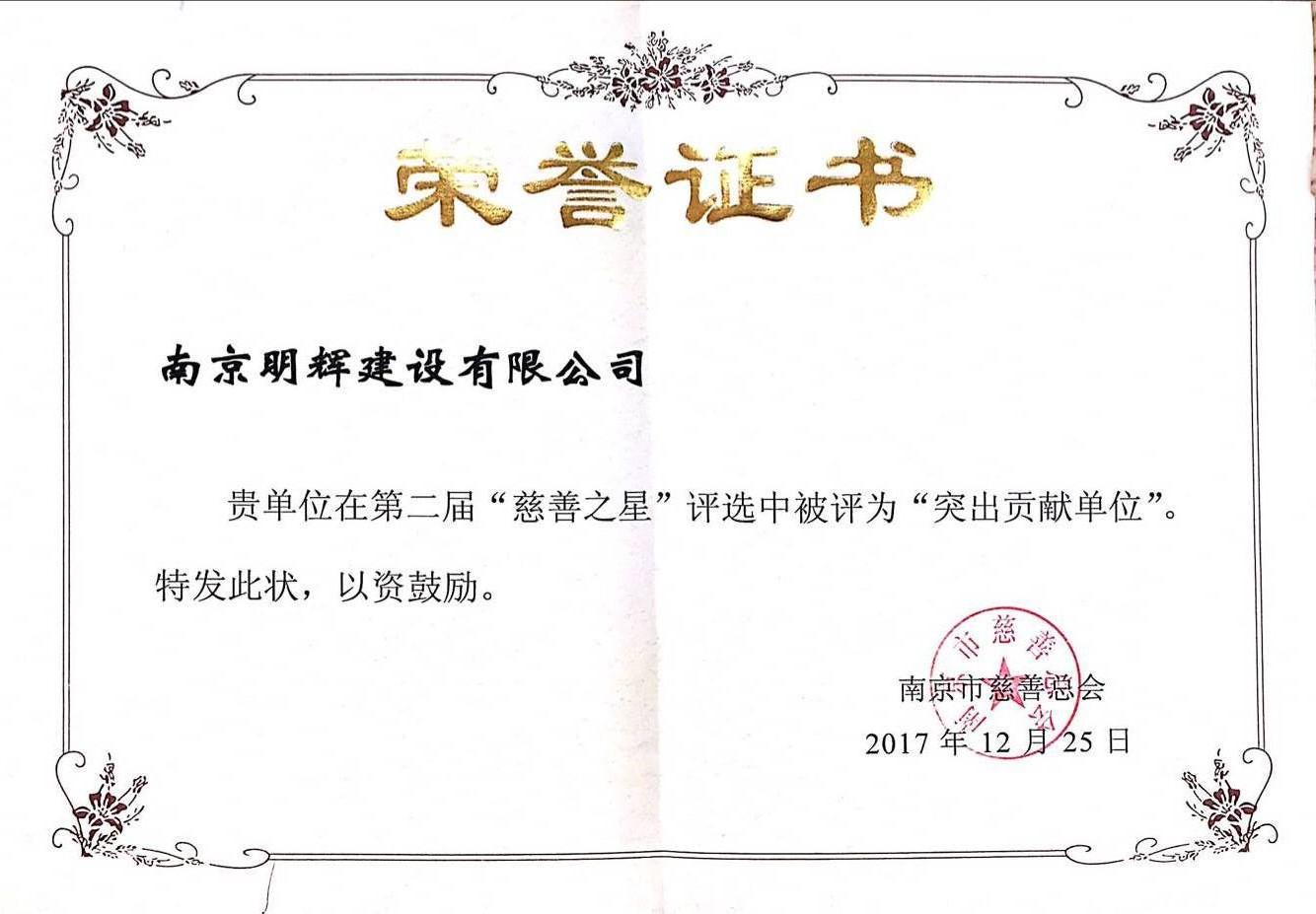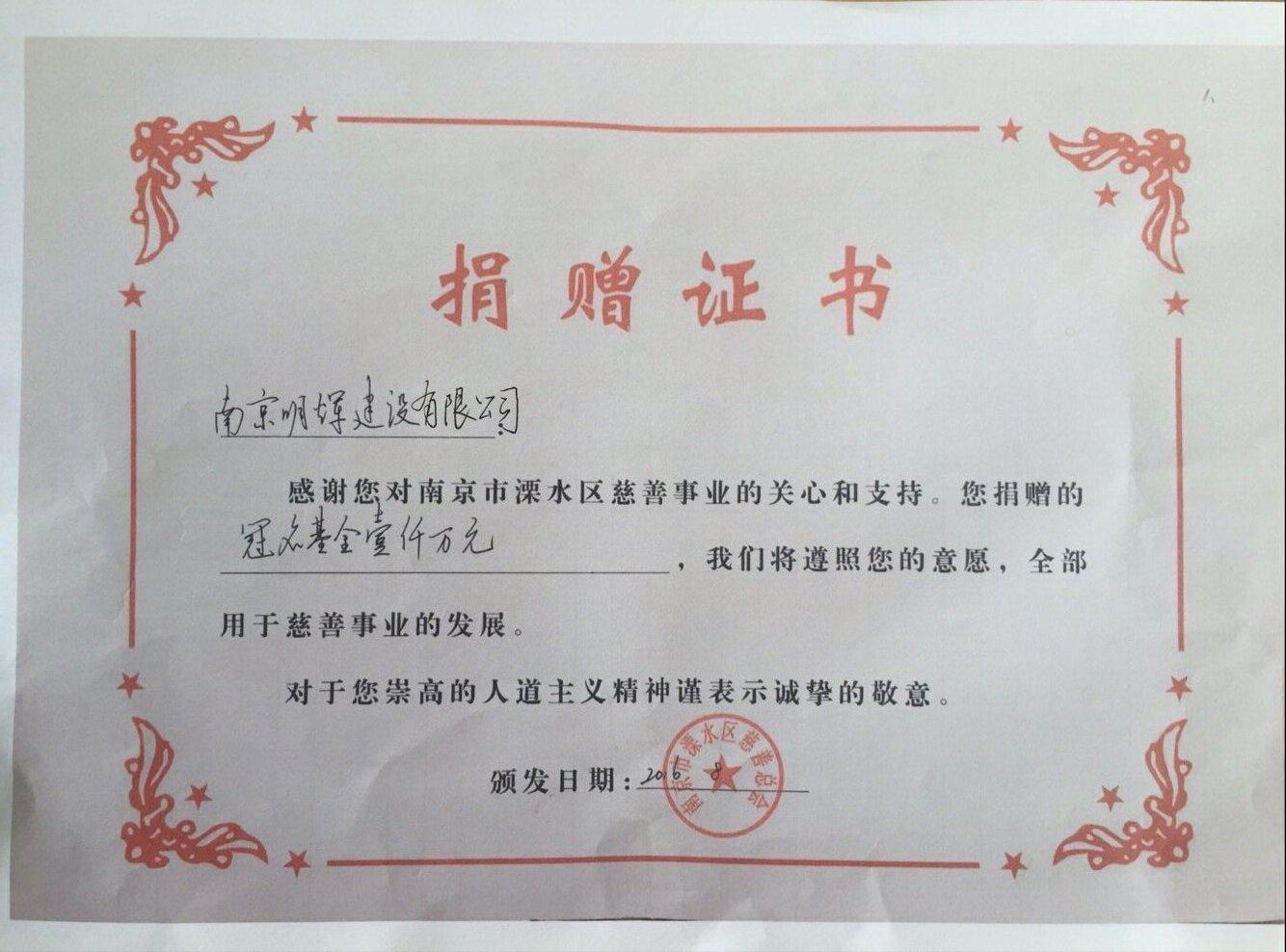 2016年,集团公司冠名基金壹仟万元整用于对南京市溧水区慈善事业的关心和支持;2017年,在第二届“慈善之星”评选中被评为“突出贡献单位”;同年,评为2011—2016年度红十字会系统先进集体。集团公司参加山东威海爱心基金捐赠共计人民币伍佰万元整。